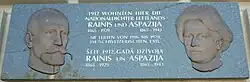 When they returned to independent Latvia after World War I, Aspazija was active in the feminist movement. She also joined the Latvian Social Democratic Workers' Party and was elected to the constitutional assembly. After Rainis died in 1929, Aspazija lived very privately in Riga or in her summer house in Dubulti. She died on 5 November 1943 in Dubulti, and was buried in the Rainis cemetery in Riga, next to her husband.[1][2]