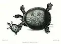 The species is identified on the basis of the structure of the carapace and plastron. There are eight pairs of costal plates, the last well developed and in contact throughout on the median line; two neurals between the first pair of costals; plates coarsely pitted and vermiculate. Epiplastra narrowly separated from each other in front of the ontoplastron, which forms an obtuse or a right angle; plastral callosities very large, hyo-hypoplastral, xiphiplastral, and, in old specimens, ento-plastral. Dorsal skin of young with longitudinal ridges of small tubercles. Head moderate; snout (on the skull) about as long as the diameter of the orbit; interorbital region, in the adult, considerably narrower than the nasal fossa; postorbital arch one third to one half the greatest diameter of the orbit; mandible with the inner edge strongly raised, forming a sharp ridge, which sends off a short perpendicular process at the symphysis; the diameter of the mandible at the symphysis does not exceed the diameter of the orbit. Olive above; back of young vermiculated with fine black lines, but without ocelli; head with a black longitudinal streak from between the eyes to the nape, intersected by two or three inverted-V shaped black streaks; lower parts yellowish. Length of dorsal disk 2 feet.[6]