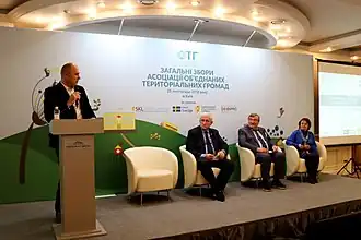 The Association of Amalgamated Territorial Communities (AACT, Ukrainian: Всеукраїнська Асоціація об’єднаних територіальних громад, romanized: Vseukrayinsʹka Asotsiatsiya ob'yednanykh terytorialʹnykh hromad, lit. 'All-Ukrainian Association of United Territorial Communities') is an organization of municipal government representing over 490 Ukrainian amalgamated municipalities. Its stated purpose is to provide political and strategic leadership to represent the interests of local municipalities established in the process of voluntary association of territorial communities[1] after Euromaidan. The AACT was founded in 2016.[2]