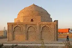 Some historians believe the structure to have been commissioned by Mahmud of Ghazni in memory of his ally (and Samanid ruler) Isma'il Muntasir; others attribute Muntasir himself.[1][3][4][a] A square structure, three of its walls have blind niches; the brickwork is intensely decorative — Paul Brummell noted it to be among the finest examples of 11th c. Turkmen architecture.[1] That the mausoleum did not become a shrine indicates that no saint was buried; it might have been a person from the secular spheres or none at all.[1][3] In Turkmen tradition, an eponymous commander of Ali was buried at the site.[3][b]