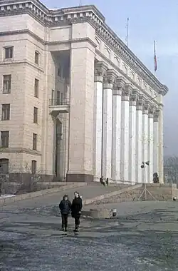 In 1921, the area was named Red Square. After the demolition of the Imperial-era buildings took place by the Soviet authorities, new government buildings were erected on the square. In 1937, the square was paved with stones for the first time. In 1955, the administrative building of Kazpotrebsoyuz was built on the corner of Panfilov Street. A monument to Soviet statesman Vladimir Lenin was erected on October Revolution Day on 7 November 1957. That same year, a construction of a new government building of Kazakh SSR was completed which is now KBTU Building. Additionally, the square was renamed to Lenin Square.