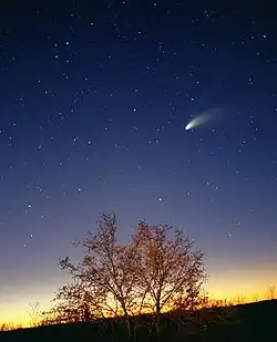 2 minute time exposure of the comet Hale-Bopp imaged using a camera on a fixed tripod. The tree in the foreground was illuminated using a small flashlight.