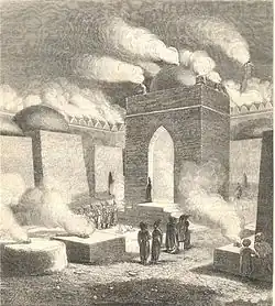 Pierre Ponafidine visited the temple and noted meeting two priests from Bombay.[44] E. Orsolle, who also visited, stated that after the death of the Parsi priest in 1864, the Parsi Panchayat of Bombay sent another priest a few years later. However, by 1880, the pilgrims from India and Iran had largely forgotten the sanctuary, and there was no one left to attend to it.[45] O'Donovan visited the temple in 1879 and described the worship of the Guebres.[46]