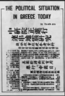 The 1973 Chinese edition of Athens News mocking the political situation in Greece during the Papadopoulos dictatorship. The editor changed his Greek name "Yannis Horn" to its pseudo-Chinese version "Ya – nih orn", and it is visible on the page.