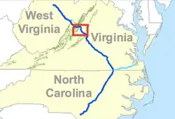 Atlantic Coast Pipeline, LLC was the developer and planned operator of the pipeline; the company was a joint venture between Dominion Energy and Duke Energy,[4][5] with Dominion serving as the lead stakeholder.[6] The proposed route was to begin in Harrison County, West Virginia, drawing gas from wells in the Utica and Marcellus gas fields, and travel southeast through eastern Virginia and North Carolina to its terminus in Robeson County, North Carolina.[4] The route would have crossed the Appalachian Trail and the Blue Ridge Parkway in Virginia[7] and included a lateral extending east to Chesapeake, Virginia,[3] bringing the total length to about 600 miles (970 km).[4] The pipeline was proposed to have a 42 inches (110 cm) diameter for much of its length, with the southern end in North Carolina measuring 36 inches (91 cm) wide.[8] It would have had a capacity of about 1,500,000,000 cubic feet (42,000,000 m3) of gas daily.[9]