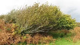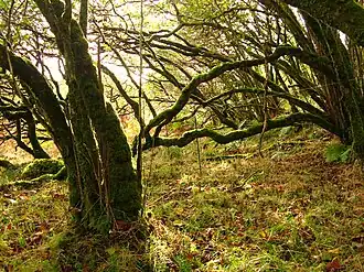 Atlantic hazelwood is hazel (Corylus avellana) dominated temperate rainforest that occurs on the hyperoceanic western fringe of Europe, in particular on the west coasts of Scotland and Ireland. It is considered to be a type of climax scrub. It occurs in exposed, coastal situations where thin soils and strong winds prevent the establishment of trees.