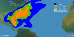The favorable conditions found during September begin to decay in October. The main reason for the decrease in activity is increasing wind shear, although sea surface temperatures are also cooler than in September.[33] In October, only 1.8 cyclones develop on average, despite a climatological secondary peak around 20 October.[42] By 21 October, the average season features 9 named storms with 5 hurricanes. A third major hurricane occurs after September 28 in half of all Atlantic tropical cyclone seasons.[23] In contrast to mid-season activity, the mean locus of formation shifts westward to the Caribbean and Gulf of Mexico, reversing the eastward progression of June through August.[7]