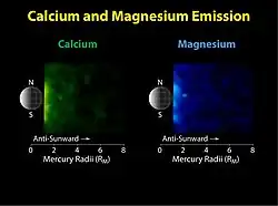 The fourth species detected in Mercury's exosphere was sodium (Na). It was discovered in 1985 by Drew Potter and Tom Morgan, who observed its Fraunhofer emission lines at 589 and 589.6 nm.[5] The average column density of this element is about 1 × 1011 cm−2. Sodium is observed to concentrate near the poles, forming bright spots.[6] Its abundance is also enhanced near the dawn terminator as compared to the dusk terminator.[7] Some research has claimed a correlation of the sodium abundance with certain surface features such as Caloris or radio bright spots;[5] however these results remain controversial. A year after the sodium discovery, Potter and Morgan reported that potassium (K) is also present in the exosphere of Mercury, though with a column density two orders of magnitude lower than that of sodium. The properties and spatial distribution of these two elements are otherwise very similar.[8] In 1998 another element, calcium (Ca), was detected with column density three orders of magnitude below that of sodium.[9] Observations by the MESSENGER probe in 2009 showed that calcium is concentrated mainly near the equator—opposite to what is observed for sodium and potassium.[10] Further observations by Messenger reported in 2014 note the atmosphere is supplemented by materials vaporized off the surface by meteors both sporadic and in a meteor shower associated with Comet Encke.[11]