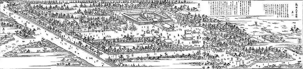 The shrine's buildings were maintained by donations from a number of benefactors, including well-known Sengoku period figures like Oda Nobunaga, Toyotomi Hideyoshi and the Tokugawas. For example, the Nobunaga-Bei, a 7.4 m high roofed mud wall, was donated to the shrine in 1560 by Nobunaga as a token of gratitude for his victory at the Battle of Okehazama.[13] A wooden gate called Kaijō-mon (海上門 lit. "Sea Gate") was made along with the mud wall. This gate was a National Treasure and was lost during the Pacific war bombings on 17 May 1945.[14][15] The west gate was a larger wooden structure called Chinkō-mon (鎮皇門) that was used for imperial processions.[16] It was dedicated by Kato Kiyomasa. This gate was also registered as a national treasure, it was lost 29 July 1945 in another air raid.[17][18] and replaced with a simple wooden torii. The east gate Shunkō-mon (春敲門) was dedicated to Yang Guifei, who according to legend found refuge here. A water spring is also connected to her legend.[19][20]