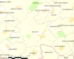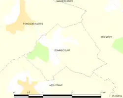 Gommecourt is a village to the south-east of Foncquevillers (Funky Villas to the British) and north-east of Hébuterne on the D 6 road to Puisieux. The village is 9.3 mi (15 km) from Albert. From late 1914 to early 1917, the Western Front turned north-east towards Arras and thence northwards to La Bassée and the bend in the line became known as the Gommecourt Salient.[1] The village is atop four low, flat-topped ridges in the shape of a flattened X, the ends pointing towards Essarts, Rossignol Wood, the west side of Hébuterne and the eastern fringe of Foncquevillers. On the north-west side of the salient, the German front line was below the crest of the west side of Essarts Ridge facing a shallow valley, with the British front line on the other side, which was overlooked for about 2,000 yd (1,800 m) over the level ground to the rear of the British line, except where the ruins and trees of Fonquevillers blocked the view.[2]