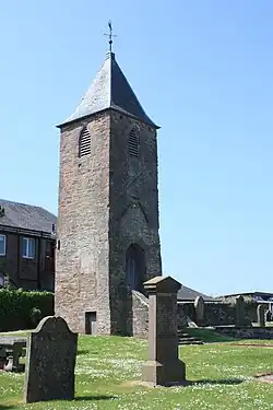 In 1834, a controversy over the selection of a parish minister, following the recent passing of the Veto Act, allowed the parishioners of Auchterarder to reject the chosen minister, Rev. Robert Young.[6] Whilst this might have ended with the selection of an alternative, Young took the issue to the High Court. The court's decision concluded a link between state and church, directly contradicting the church's own view, and causing the first in a chain of events which would ultimately lead to the 1843 schism in the Church of Scotland. The remains of this church – the tower – have recently been renovated, and there is a plaque explaining what the church used to look like. As a result of the troubles of 1834, Auchterarder became one of the first towns in Scotland to build its own independent Free Church, indeed appearing to pre-empt the Disruption by commissioning the architect David Cousin to design their church in advance, such that it was completed in 1843 as soon as the Free Church formally came into existence.[7]