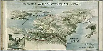 Beginning in 1859, land reclamation in the Waitematā Harbour enabled Auckland to become a shipping hub, facilitating the export of goods such as gold from the Thames gold rush and kauri logging, until these resources were exhausted in the early 1900s.[48] By 1890, 53 hectares of land was reclaimed at the Ports of Auckland.[49] In the 1880s, many headlands of the Waitematā Harbour were developed into military forts due to concerns over a potential invasion from Russia,[49] including Point Resolution in Parnell and Bastion Point at Ōrākei (however most prominently seen at North Head and Mount Victoria on the North Shore). During the 19th century, plans for a canal (variously at the Ōtāhuhu portage or the Whau River portage) linking the two sides of the isthmus were widely discussed, however plans never eventuated, and by the 1910s the idea had been abandoned, after the completion of the North Island Main Trunk railway.[50]