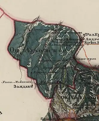 After the end of the Caucasian War, at the place of residence of the Aukhites, for some time there was an administrative unit - the Aukh District. On October 1, 1862, the Upland District of the Terek Region was formed, which included the Aukh, Salatov and Zandak districts.[4][5]