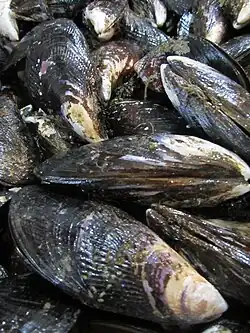Aulacomya atra, called also the Magellan mussel[2] or the ribbed mussel,[1][3] is a southern species of edible saltwater mussel, a marine bivalve mollusk in the family Mytilidae, the true mussels.[1] Note that the common name ribbed mussel is also used of the Northern Hemisphere mussel Geukensia demissa.