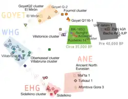 - ^ Seguin-Orlando, A.; Korneliussen, T. S.; Sikora, M.; Malaspinas, A.-S.; Manica, A.; Moltke, I.; Albrechtsen, A.; Ko, A.; Margaryan, A.; Moiseyev, V.; Goebel, T.; Westaway, M.; Lambert, D.; Khartanovich, V.; Wall, J. D.; Nigst, P. R.; Foley, R. A.; Lahr, M. M.; Nielsen, R.; Orlando, L.; Willerslev, E. (6 November 2014). "Genomic structure in Europeans dating back at least 36,200 years". Science. 346 (6213): 1113–1118. Bibcode:2014Sci...346.1113S. doi:10.1126/science.aaa0114. PMID 25378462. S2CID 206632421.