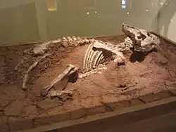Explorations in the red beds in the north of Yujingzi Basin in 2006 and 2007 by the Field Museum of Natural History, American Museum of Natural History, and FDRC discovered a graveyard of Auroraceratops specimens.[2] A series of at least 50 well-preserved specimens of Auroraceratops were recovered in the late summer of 2007, and excavations in subsequent seasons by the FDRC, Gansu Geological Museum (GGM) and University of Pennsylvania among other institutions brought the count of individuals of Auroraceratops to 80 by the end of the 2010 field season.[4] One specimen from this area, GGM-FV-00500, was described in 2012 by You and colleagues, who considered it to represent a new species of Auroraceratops, but lacked data to justify giving it a name.[5] This specimen, along with the others found in Yujingzi Basin, we reassessed as belonging to A. rugosus by You, American paleontologist Eric M. Morschhauser, and colleagues in 2019.[2][3][6][4] All specimens of Auroraceratops from the Yujingzi Basin are closely associated to fully articulated, with varying levels of completeness. Most specimens, which were recovered in individual plaster jackets, consist of a single individual, though some include several associated individuals.[4]