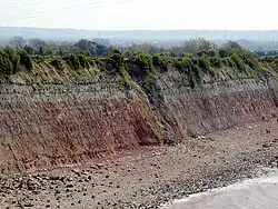 The lower part of the cliff is a red mudstone, with bands of nodules of pinkish-white alabaster. Above the red mudstone is green mudstone, followed by the Rhaetic bone bed at the base of a band of black shale. Above the shale are cream-coloured limestone beds.[1]