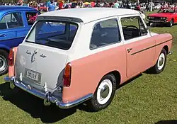 The Countryman hatchback appeared exactly a year later in October 1959,[9] and differed from the saloon in that the rear window was marginally smaller, to allow for a frame that could be lifted up, with its own support, while the lower panel was now flush with the floor and its hinges had been strengthened.[10] It was a very small estate car with a horizontally split tailgate having a top-hinged upper door and bottom-hinged lower door. October 1959 also saw the standardisation on both cars of self-cancelling indicators and the provision of a centre interior light and, in early summer 1960, a flat lid was added over the spare wheel in the rear luggage compartment.[9]