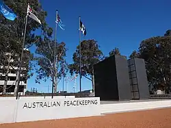 The Australian Peacekeeping Memorial, located at the southern end of Anzac Parade in Canberra, Australian Capital Territory, commemorates the service and sacrifice of all Australians who have served on peacekeeping or peacemaking missions around the world. It was inaugurated on 14 September 2017 by the Governor-General of Australia, General Sir Peter Cosgrove AK MC. The Memorial is a living memorial that commemorates the service of all Australian peacekeepers- past, present and into the future.