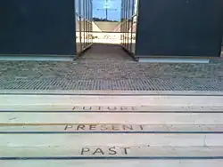 Through the passageway of light is the second element, the cobblestone Courtyard, a peaceful gathering space for personal reflection and ceremonial purposes. On the courtyard surface are bronze plaques inscribed with words describing the personal traits of Australian Peacekeepers progressing to the values, actions, activities and finally the objectives of international peacekeeping as the plaques advance across the courtyard in parallel with the path of travel from front to rear.