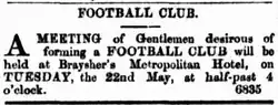 Not long after the redrafting of the laws on 1 May 1866 and the widespread distribution in the Australasian on 19 May, an advertisement appearing in the Brisbane Courier on 21 May called for a meeting to form a Brisbane club.[5] The first Brisbane Football Club was incorporated the following day on 22 May 1866 and chose to play under the then widely distributed Victorian Rules.[6]
