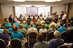 Committees are designed to assist the Senate as a whole. Thus the main formal structure of their work is that the Senate refers something to a committee for examination, and the committee reports back to the Senate on that matter. These reports are tabled during parliamentary sittings, but can also be presented when the Senate is not in session.[19] Committees can gather evidence and will often hold public hearings to assist this process.[20] To gather their evidence committees can (with exceptions) travel from place to place to hear evidence.[21] Committees are able to order the production of documents and the appearance of witnesses (powers that are in practice used very sparingly).[22][23] Most evidence taken by committees (both written submissions and transcripts of public hearings) is published, however committees have the power to take evidence confidentially (in camera), and regularly do so.[24] Committees hold both public hearings and conduct business at private meetings. The minutes of private meetings are confidential (in contrast, for example, to those of New South Wales parliamentary committees).[25]