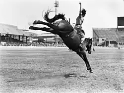 The term buck-jumping, as a regular activity involving horses, was in use in Australia by 1855.[1] Newspaper reports recorded public roughriding events that took place in Victoria during the 1880s. These events included competitions for roughriding and bullock-throwing which was accomplished by riding up to bullock, grabbing its tail and throwing it off balance and then tying its legs. This competition arose from the stockman's skill in capturing feral or wild cattle.[2]