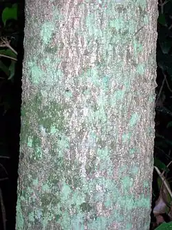 A medium to large tree, 40 metres tall[1] and a trunk diameter of one metre. The trunk is flanged or irregular, somewhat buttressed at the base. Bark is scaly, grey or brown and sheds in irregular patches, leaving slight depressions. Small branches are slender, grey or fawn in colour, dotted with many pale lenticels.