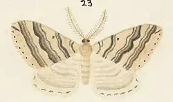 ♂. 38-39 mm. Head, palpi, thorax, and abdomen pale greyish-ochreous. Antennal pectinations moderately long. Forewings triangular, costa almost straight, rather strongly arched apically, termen subsinuate, oblique; pale greyish-ochreous; markings fuscous-brown; numerous thin waved more or less parallel transverse lines, forming more distinct bands near base, before middle, at f and J; an obscure discal dot; outer margin of third band sinuate inwards above and below middle; an inwardly oblique thin subapical streak; a terminal series of black dots, connected by a very faint waved line. Hindwings pale ochreous-grey with markings similar to forewings but suffused and obscure : cilia as in forewings.[3]