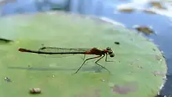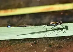 Austrocnemis splendida is a tiny damselfly, bronze-black in colour with very long legs. Males have a blue patch on each side of their body and a pale blue tail band;[4] females have red on their body with no tail band. It is found in eastern Australia, where it inhabits streams and slow-moving water.[5] It is commonly found sitting flat on a waterlily or other floating leaf.[6]