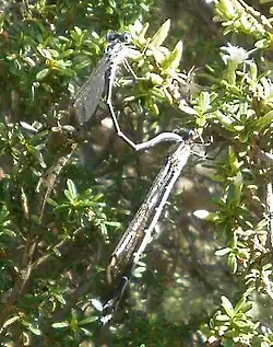 Emergence occurs during the day from the months of October to February, with the majority bursting around January.[13] However adults can be found at late as May in Dunedin and in early June in Northland.[8] After emergence and maiden flight, young adults mature sexually for several days; during this time there can be quite a high number of dispersals.[8] Once males reach maturity they venture out to find habitats suitable for breeding and to set their territories where they stay motionless on their established porch for extended periods of time until they are bothered by an intruder.[8] Early afternoons, the height of reproductive activity, you will see males go chasing after females that fly through their territory. The mating "wheel" lasts for 10 minutes, and egg-laying generally occurs in tandem; the pair land on a floating piece of vegetation and the female drives a shaft through the stem and into the pith.[9][8] She then lays 6–9 eggs, taking up to a minute. This is repeated and eggs are laid out either in close batches or spaced between one another. Once the nymphs, known as pronaiads, are hatched they begin to search for water so they can moult and release the second larval instar (about 2.3 mm long).[8] These nymphs are quite active swimmers; once they reach a later stage they roam about on the surface of detritus and vegetation on the bottom of ponds.[8]