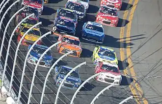 ![]() Many stock cars entering the first turn during the 2023 EchoPark Automotive Grand Prix | |
