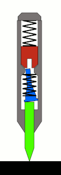 The earliest US patents for the modern automatic center punch were filed during 1904 by Hartley and Stryhal for designs using a leaf spring catch to release the hammer,[7][8] both assigned to Brown and Sharpe. In 1905, Seitz patented a manually triggered punch that has many of the internal structural elements of some later fully automatic models,[9] and Spalding was granted a patent in 1908 on an application filed in 1904 for a different design of leaf spring controlled fully automatic punch that included easy adjustment of blow as well as interchangeable, threaded on points.[10]