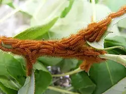The caterpillars are herbivorous and gregarious in all their instars, and may be seen traveling in single-file processions over the food plant.[10][19][7] In certain regions of the country, larvae may have preferred hosts out of the long list that this species can accept elsewhere. As the larvae develop, they will lose their orange color and will turn bright green and urticating, having many spines. The green caterpillars have two lateral stripes, the upper one being bright red and the lower one being white. These caterpillars can reach sizes of 7 cm in length.[20] When the caterpillars are ready, they spin a flimsy, valveless cocoon made from a dark, coarse silk. Some larvae will crawl to the base of the tree and make their cocoons among leaf litter on the ground, while others will use living leaves to wrap their cocoons with.[4][7] The leaves will turn brown and fall to the ground during fall, taking the cocoons with them.[4][7] There they pupate, the pupa being dark brown/black.[4] The pupae also have sexual dimorphism with the females' possessing a notch on their posterior ventral aspect, while the males' pupae bear a pair of tubercles near that area with no notch.[4]