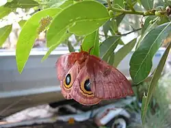 Adult Io moths normally emerge from their cocoons in late morning or early afternoon. The emergence of the adults moths is typically from June to July.[21] Eclosion (emergence from the cocoon) only takes a few minutes.[19] After eclosing, the moths climb and hang on plants so that their furled wings can be inflated with fluid (hemolymph) pumped from the body. This inflation process takes about twenty minutes. Adult moths are strictly nocturnal, generally flying during the peak hours of the night.[21] The females generally wait until nightfall and then extend a scent gland from the posterior region of the abdomen, in order to attract males via wind-borne pheromones.[4] The males use their larger antennae to detect the pheromones. After mating, the females die following egg laying. These moths have vestigial mouthparts and do not eat in the adult stage.[8][10]