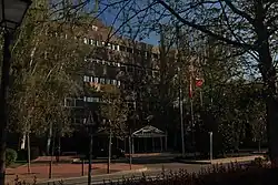 UAM's Cantoblanco Campus holds most of the university's facilities. It is located 15 km north of Madrid and has an extension of over 2,200,000 m2. Of these are nearly 770,000 urbanised and about a third of them garden areas. The campus was designed as a university town that was to be self-sufficient, but also would be away from Madrid in order to keep student activity against the Francoist dictatorship away from the capital.
