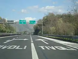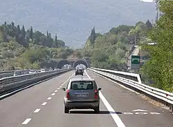 The Autostrada A24, or Strada dei Parchi ("Parks motorway") is an autostrada (Italian for "motorway") 166 kilometres (103 mi) long in Italy located in the regions of Lazio and Abruzzo connecting Rome to Teramo, near the Adriatic Sea.[1] Starting from the Grande Raccordo Anulare (GRA – the Rome orbital motorway), the A24 runs broadly north-east across the Abruzzese Apennine Mountains. Between L'Aquila and Teramo it passes through the 10 kilometres (6.2 mi) Gran Sasso Tunnel. The private company Strada dei Parchi S.p.A. currently manages the motorway. The name "Parks Motorway" comes from the fact that the Maiella National Park, the Abruzzo, Lazio and Molise National Park and the Gran Sasso e Monti della Laga National Park can be reached from this motorway. It is a part of the E80 European route.
