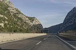 The Autostrada A25 or Strada dei Parchi ("Parks Motorway") is an autostrada (Italian for "motorway") 114 kilometres (71 mi) long in Italy mostly located in the region of Abruzzo connecting the Torano interchange (where it splits from the Autostrada A24) to Pescara and Autostrada A14, in the Adriatic coast. The A25 takes its name "Parks Motorway" from the Maiella National Park, the Abruzzo, Lazio and Molise National Park and the Gran Sasso e Monti della Laga National Park, all served and connected to the national motorway system by it. It is part of the E80 European route.