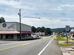 The route passes through downtown Heber Springs, specifically passing the T.E. Olmstead & Son Funeral Home, Hugh L. King House, the Cleburne County Courthouse, and properties within the Heber Springs Commercial Historic District, each listed on the National Register of Historic Places.