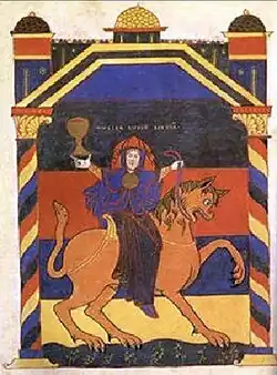 Ava has been the subject of multiple legends portraying her negatively, often linking her to conflicts and rebellions in Castile during her husband's reign. In one known legend, named la llegenda de la comtessa traïdora ('The Legend of the Traitorous Countess'), she betrayed García Fernández, who was captured in a raid by the Moors and killed, after having committed adultery with Al-Aziz Billah.[3] According to the legend, after the death of her spouse, she attempted to poison his successor and her son by handing him a cup of poison, because she wished to marry Al-Aziz Billah; he, however, forced her to drink it herself, which resulted in her death.