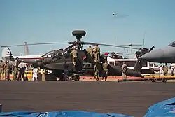 There were about 100 aircraft, including bombers, fighters and surveillance aircraft present at this edition. The show saw the premiere of the most advanced stealth air superiority fighter, the Lockheed Martin F-22 Raptor. Two aircraft, based at Elmendorf Air Force Base, were on static display for the first time in Australia, .[25][26][27] They did not perform, because the qualified display pilot was not present.[28] A highly detailed model of the under development Lockheed Martin F-35 Lightning II Joint Strike Fighter was on static display beside a classic F/A-18 Hornet.[29][30]