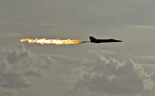 ![]() RAAF F-111 at the 2007 Airshow performing a dump-and-burn, a procedure where the fuel is intentionally ignited using the plane's afterburner. | |