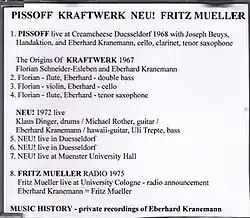 Pissoff was a band founded in the late 1960s by Kranemann and some friends. Eberhard had studied under Beuys, and the artist is featured with Pissoff on the first track, recorded in Düsseldorf's Creamcheese club. Shortly after this recording, Florian Schneider joined the band. An unedited version of this track was also released separately by Kranemann.