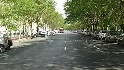 Originally envisioned as a jardin street under the name of "camino-paseo hasta el mar" the project was approved by law on 1 August 1893. The aim of the street was to link the Jardines del Real in the west to the Poblats Marítims in the east of the city. Finished in 1895, a first design was made by Casimiro Meseguer who intended to make the street part of a green city plan he called "Ciudad Jardín".[1] It was made with the bourgeoisie in mind, with villas for the rich directly on the avenue and less expensive houses behind it. Meseguer's design gave the street a width of 100 meters and included three large plazas with a diameter of 200 meters. A central part of the street would be a 60-meter wide landscaped stretch, streets ending on the camino would have a width of 20 meters.[2]
