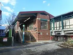 Another station house is on the north end of the southbound platform, adjacent to the west side of the track. The ADA-accessible ramp and a stair leads to the unstaffed brick station house. The ramp wraps around the station house to adjust for the height difference between the station house and ground level. This station house contains a bank of regular and High Entry/Exit Turnstiles.[39]