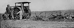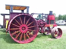 Avery started building agricultural trucks in 1910. Early truck manufacturers were uncertain how to market their product and whether they should just be used to haul goods or should also be useful in the field. Avery described its truck as a 'gasoline farm wagon' and 'general farm power machine' for city, town, and country hauling. Their advertising suggested the farmer could use it to haul livestock, grain, hay, and other loads, as to pull plows, road graders, harrows, discs, binders, and other farm machinery, as well as loaded wagons.[4] The truck weighed 1 short ton (0.91 t) and featured a four-cylinder engine, open cab and chain drive. Its wheels had wooden spokes and rims, while the steel tires were 1.5 inches (38 mm)x5 inches (130 mm) wide.[4] Avery figured farmers could get the most use out of the machines during the harvest season. Their tractor trucks included a large belt pulley that could be attached to the front crank shaft, useful for powering grain separators and other belt-driven machines. Early models had cast steel wheels with holes. Wooden plugs were driven into the holes to provide added traction. When the wooden plugs wore down, the owner simply replaced them with new wooden plugs.[9]