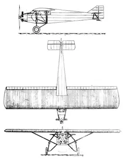The empennage was conventional and angular, constructed in the same way as the wing. The horizontal tail was almost rectangular in plan and was mounted on top of the fuselage, supported by inverted V-struts from below. The fin was triangular and carried a deep, rectangular rudder which ran down to the keel, operating in a small elevator cut-out.[2]