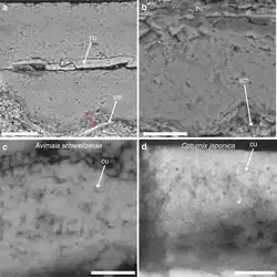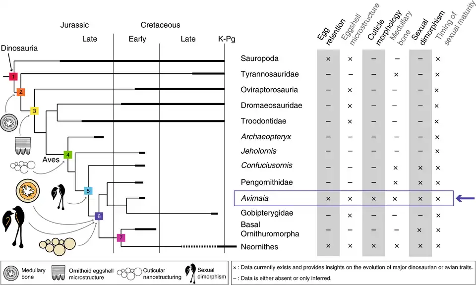 - ^ a b c d e f g h i j k l m n o p q r s Bailleul, Alida M.; et al. (20 March 2019). "An Early Cretaceous enantiornithine (Aves) preserving an unlaid egg and probable medullary bone". Nature Communications. 10 (1275): 1275. Bibcode:2019NatCo..10.1275B. doi:10.1038/s41467-019-09259-x. PMC 6426974. PMID 30894527.
