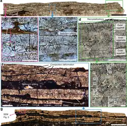 A section showed the presence of four to six separate shells stacked on top of each other, each about 0.05 millimetres thick. Each shell consists of three layers, as with modern birds and generally in derived dinosaur eggs. There is an inner mammillary layer, an intermediate prismatic layer and an outer crystalline layer. The three layers combined are rather thin: earlier reported shells of Enantiornithes are thicker. Another anomaly consists in the fact that the prismatic layer and outer layer combined are thinner than the mammillary layer, whereas normally the opposite is true. On the surface of the egg a brown organic layer is visible, which was identified as the cuticle. In the cuticle nanospheres of calcium phosphate were discovered, which are also present in the cuticle of some extant birds. Additionally, remains were identified of the egg membrane, the membrana testacea. The fibres of the membrane are individually visible and have a length of 1.5 to 4 micrometres. They possibly contain part of the original proteins. It is likely that during fossilisation, the egg shells shifted in relation to each other and were otherwise distorted.[1]