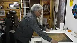 Avraham Eilat (Hebrew: אברהם אילת; born 1939 in Tel Aviv, Mandatory Palestine) is an Israeli artist, educator and curator. He graduated from the Hebrew Gimnasium Herzliya in Tel Aviv and was enrolled in Hashomer Hatzair youth movement for nine years starting at age 9. After military service in 1960 he joined in Kibbutz Shamir, situated on the western slopes of the Golan Heights in the Upper Galilee, where he was a member until 1978. During his first years in the kibbutz, Eilat was a shepherd side-by-side with his kibbutz adopting father the painter Moshe Cagan. Close contact with nature and its phenomenon and the features of local landscape deeply influenced his way of thinking and established the themes appearing along all his career in his art. The contrast between man-made geometrical shapes of fish ponds and the free flowing of the flora and typical hilly landscape of the Hula Valley area, crystallized his visual language and determined its formal and thematic foundations. Avraham Eilat employs skillfully various means of expression: drawing and painting, etching, photography, sculpture, installation, and often a combination of more than one. Using those means enriches his basic statement and makes it complex and multi-layered. Avraham Eilat lives in Ein Hod Artists Village, Israel, with his spouse Margol Guttman, works in his studio in Pyramida Center of Contemporary Art, Wadi Salib, Haifa, and in his studio in Ein Hod.